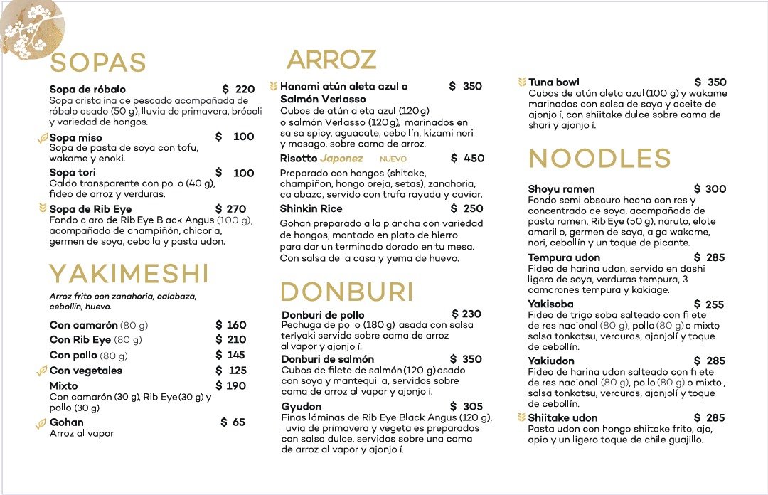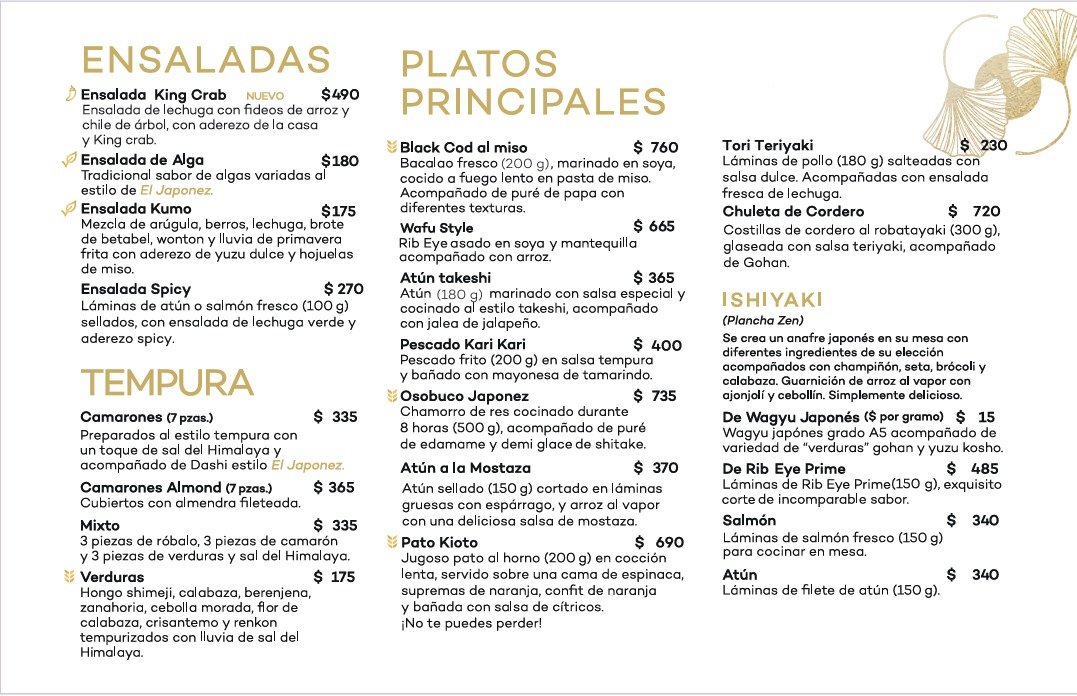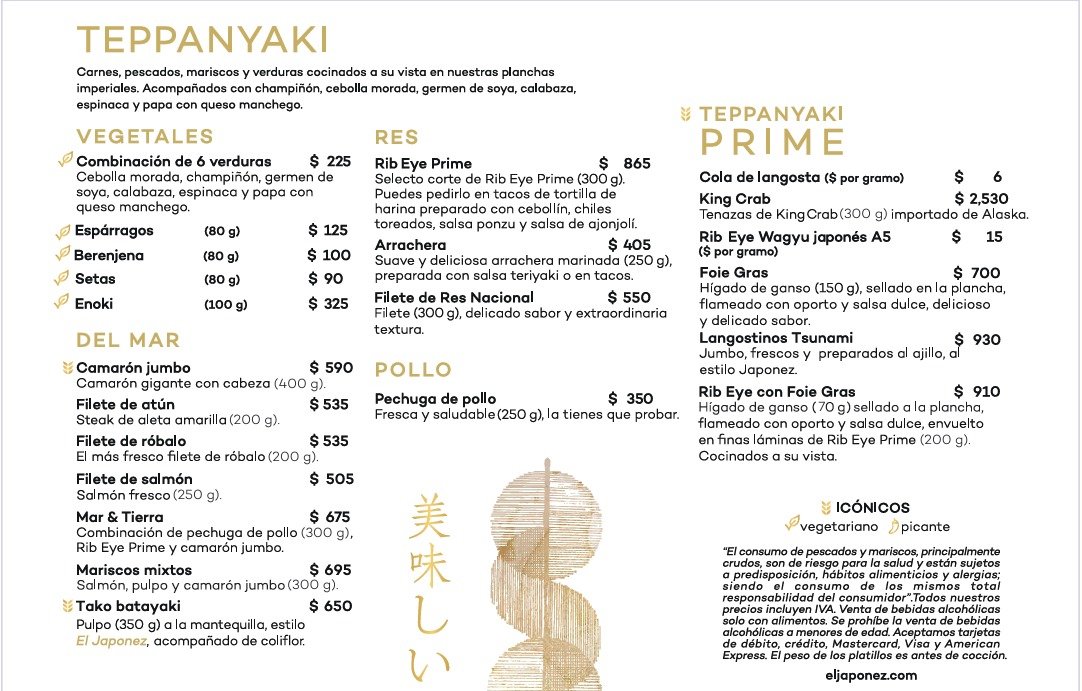La oferta en El Japonez va mucho más allá del sushi. En diferentes reseñas y menús se encuentran elementos como: brochetas yakitori y robatayaki